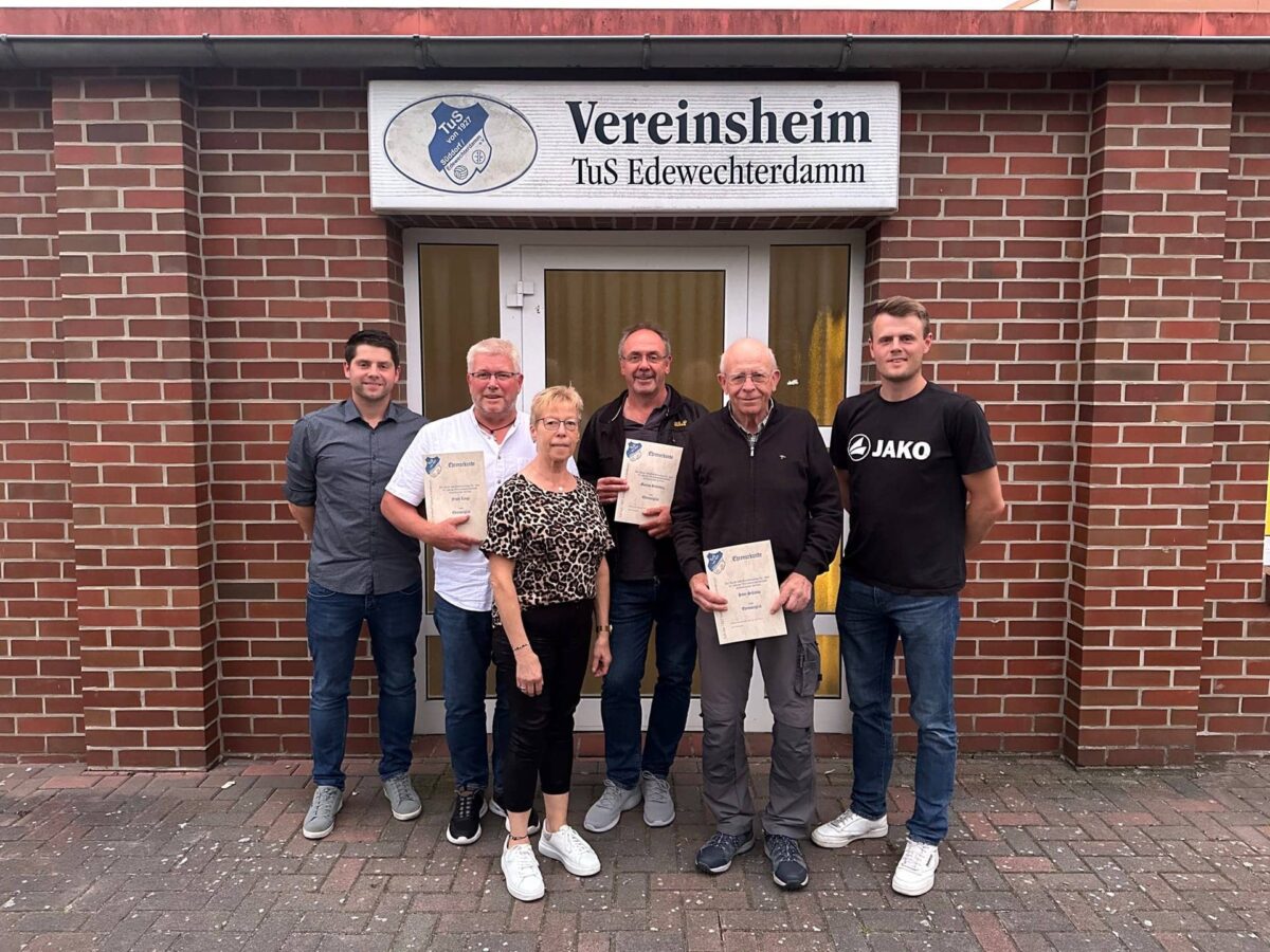 Freuen konnten wir uns in diesem Jahr über zahlreiche Ehrungen: So konnte unser 1. Vorsitzender Hauke Meschkat mit Peter Schimke, Frank Lange und Matthias Gröneweg gleich drei Personen aufgrund ihrer nun 50-jährigen Vereinsmitgliedschaft zu Ehrenmitgliedern des TuS ernennen. Inge Lange erhielt derweil eine Ehrennadel für ihre 25-jährige Mitgliedschaft im TuS.